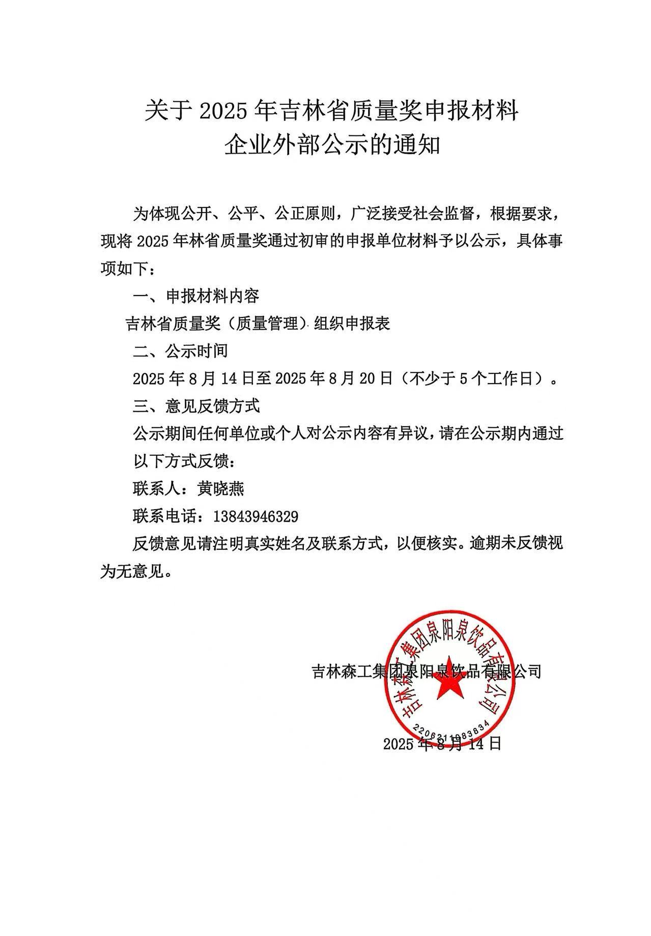 關(guān)于2025年吉林省質(zhì)量獎申報材料企業(yè)外部公示的通知